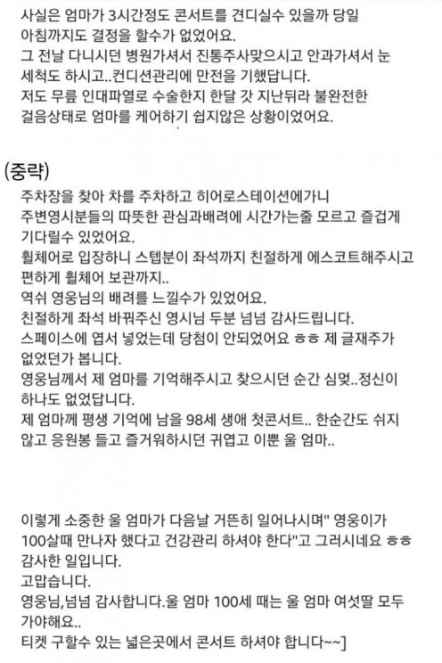 A 씨가 소개하는 이야기에 따르면, 98세의 어머니와 함께 광주에서 열린 임영웅의 콘서트에 참석한 경험이 있습니다. A 씨는 수술 후 한 달이 지나지 않아 아직 무릎이 회복 중이었고, 어머니도 진통주사를 맞아 컨디션을 조절하면서 콘서트에 참석했습니다.